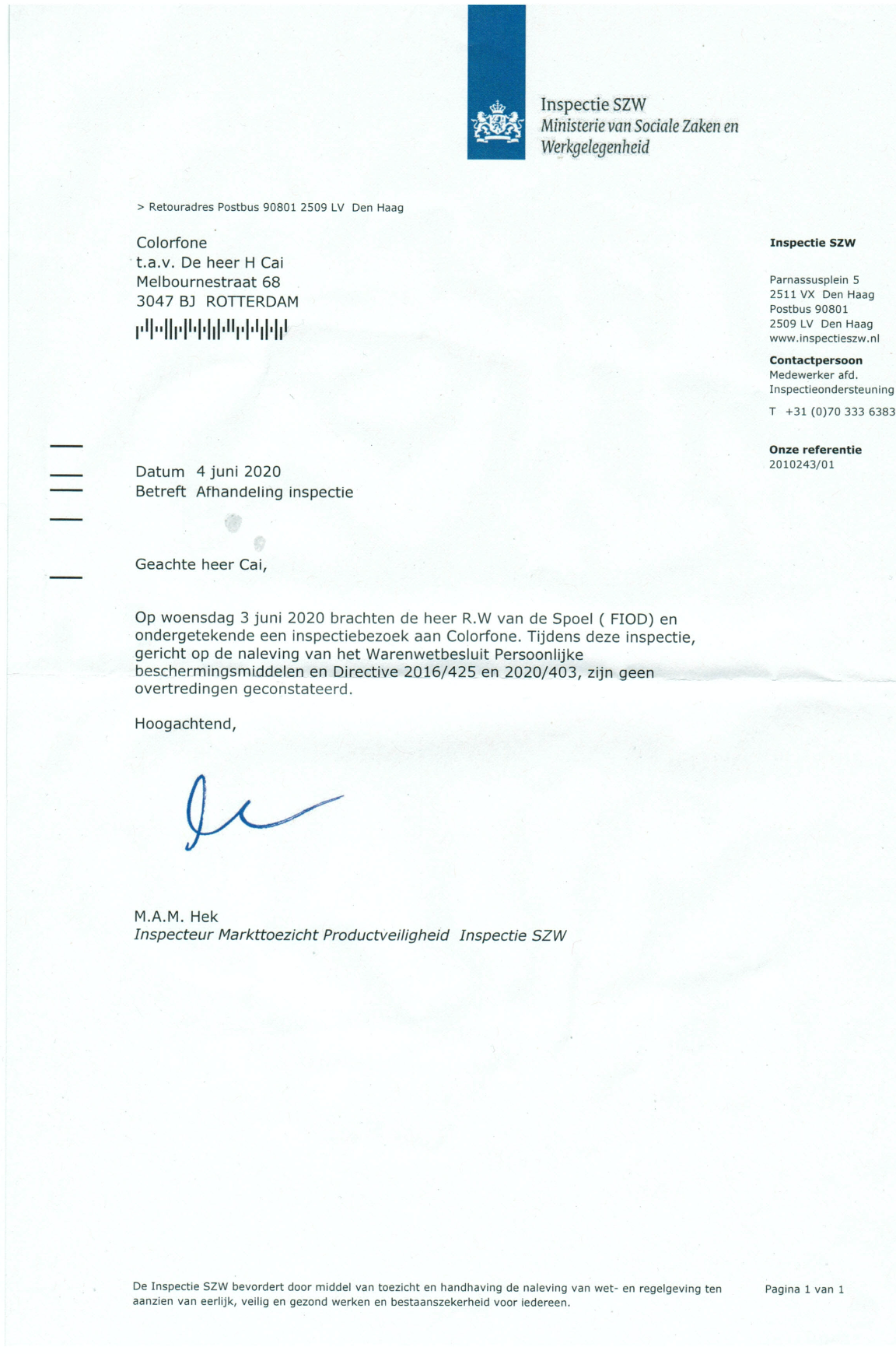 On Wednesday 3 June, there was an inspection of the FIOD and the SZW (Ministry of Social Affairs and Employment). During this inspection, our Personal Protective Equipment PPE was checked with all associated test reports (TUV, BSI) and associated papers. No violations were found and these remedies were approved.